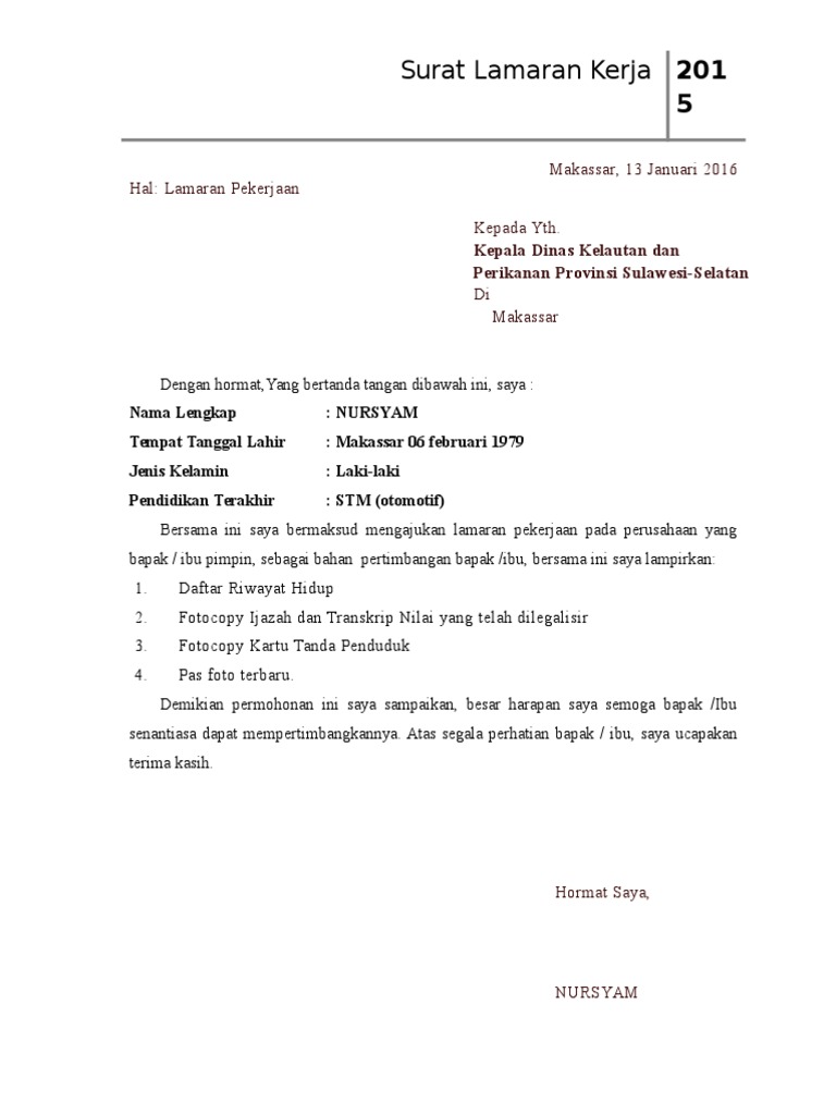 Demikian surat lamaran ini saya buat dengan data yang sebenarnya, atas perhatian serta kebijaksanaan dari bapak/ibu saya ucapkan terima kasih. Berikut contoh surat lamaran pekerjaan terbaru 2019 resmi yang baik dan benar dengan format formal yang bisa anda unduh untuk melamar di perusahaan bumn. Surakarta, 7 juni 2016 kepada yth. Dan panduan tips melamar kerja agar cepat. Hal yang perlu anda perhatikan saat membuat surat lamaran kerja adalah format penulisannya. Contoh surat lamaran kerja kedua ini, cocok buat yang telah punya pengalaman kerja beberapa tahun sebelumnya di perusahaan lain baik itu sesuai dengan pekerjaan yang ingin diambil ataupun tidak. Surat lamaran kerja yang menarik akan memperbesar peluang melangkah. Dalam pembuatan surat lamaran kerja di pt anda harus menulis posisi yang sesuai dengan yang dibutuhkan pt tersebut. Dan seperti yang kita ketahui. Contoh surat lamaran kerja yang baik dan benar. Maka dari itu agar lamaran kerja tersebut sukses ada baik kamu membuat surat lamaran pekerjaan dengan baik dan benar. Dokumen kerja pertama kali diliat adalah surat lamaranmu, jangan sampai hrd kecewa, berikut contoh surat lamaran kerja yang baik dan benar. Contoh surat lamaran kerja di hotel.